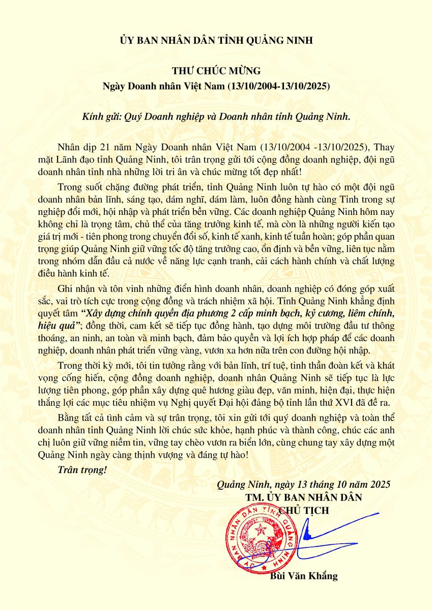 Thư chúc mừng ngày doanh nhân Việt Nam của Chủ tịch UBND tỉnh Quảng Ninh