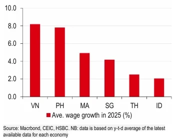 Tăng trưởng mức lương trên toàn ASEAN trong năm 2025, trong đó Việt Nam đứng đầu với mức tăng hơn 8%. Nguồn: HSBC.